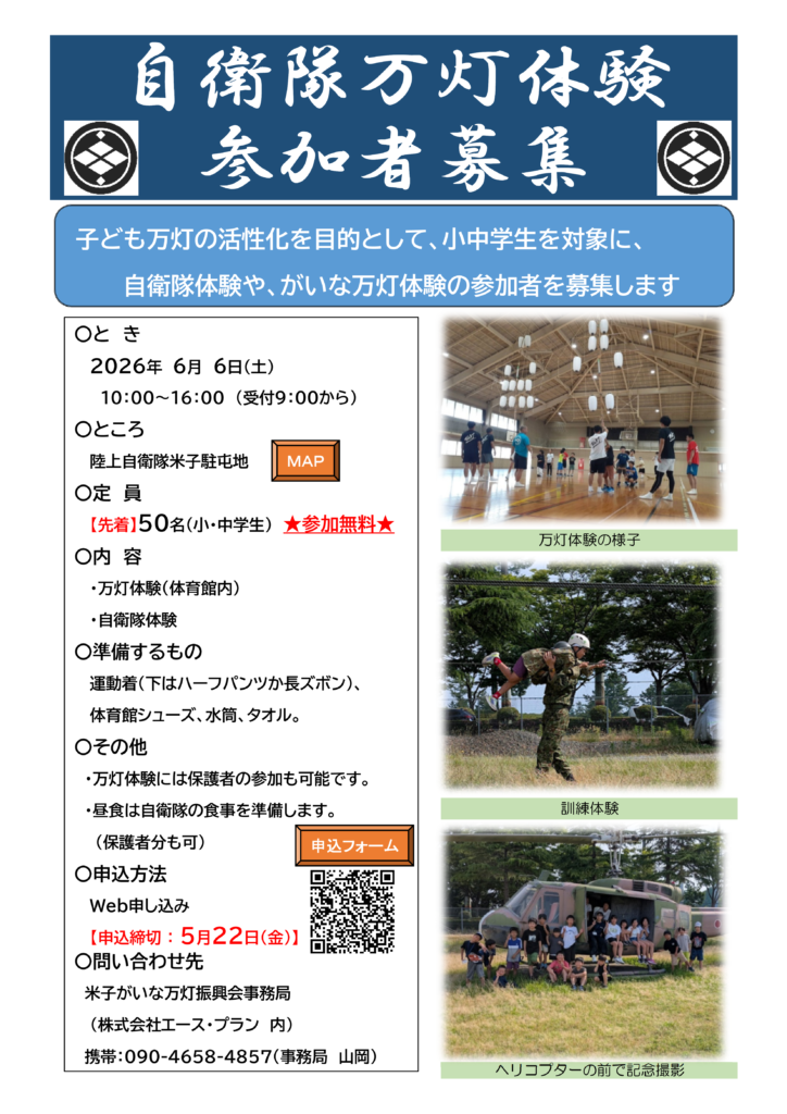 普段なかなか入ることのできない自衛隊駐屯地での訓練体験や、万灯体験、そして自衛隊の昼食も楽しめる盛りだくさんの内容です。